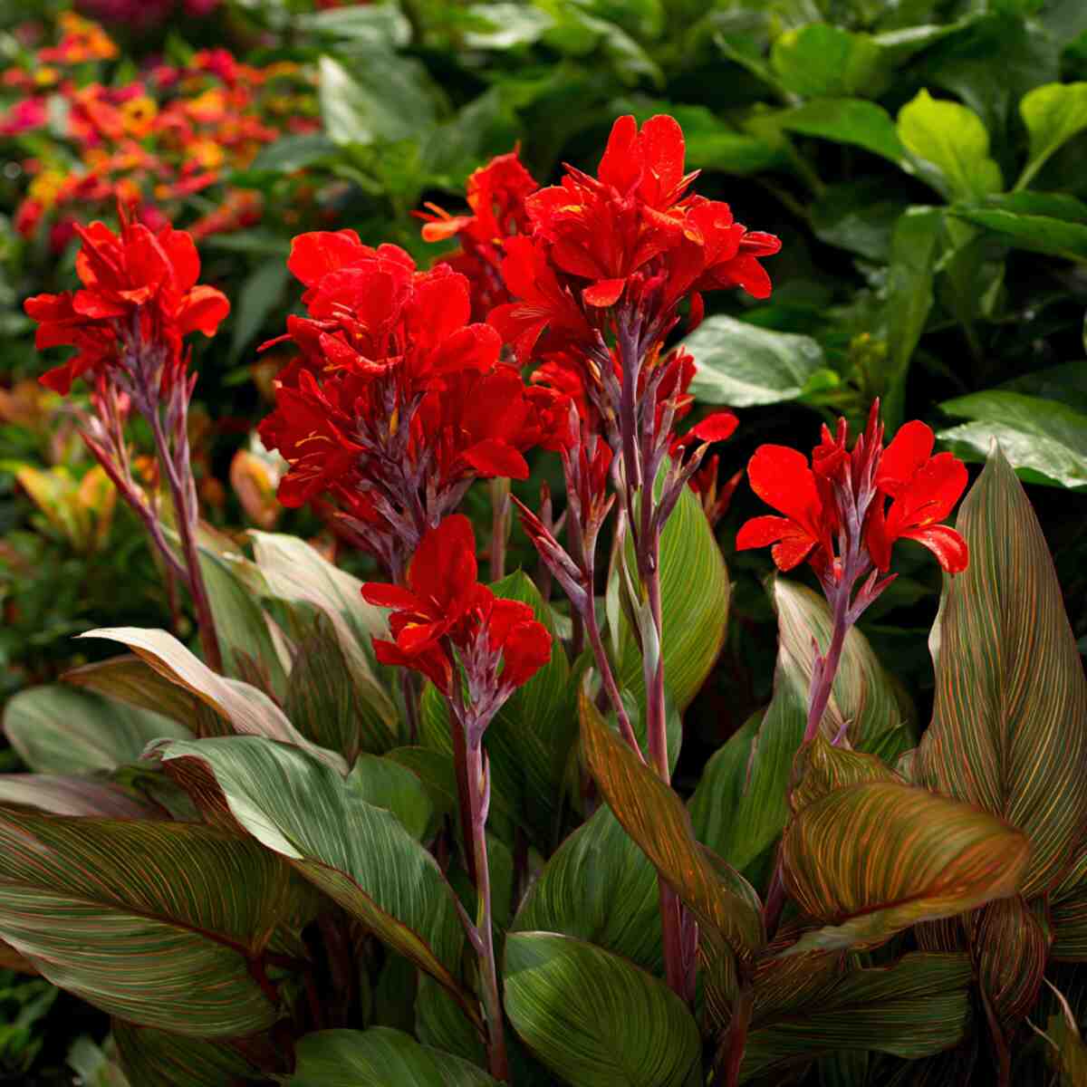 Canna lilies with fiery red flowers bring exotic flair to any garden.