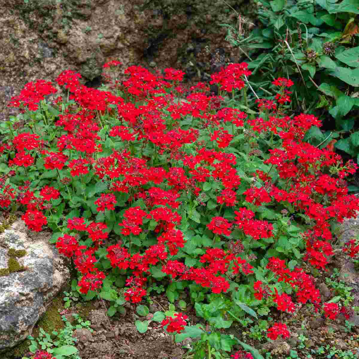 Red verbena works beautifully as ground cover, spreading a carpet of vivid blooms.