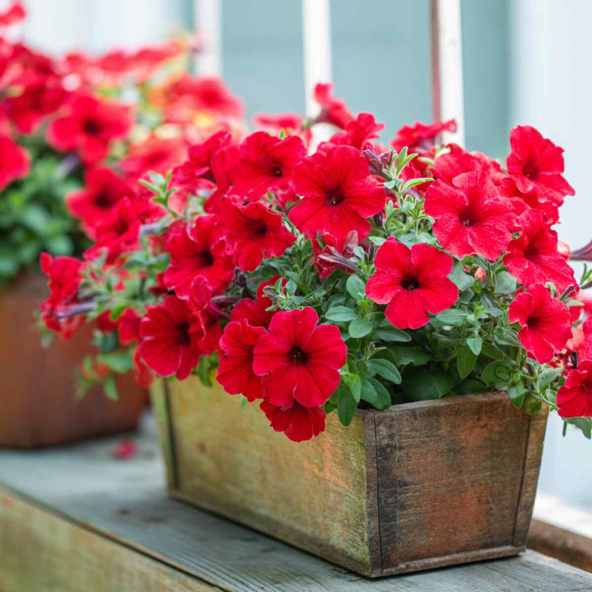 Red petunias in balcony boxes add cascading waves of color to outdoor railings.