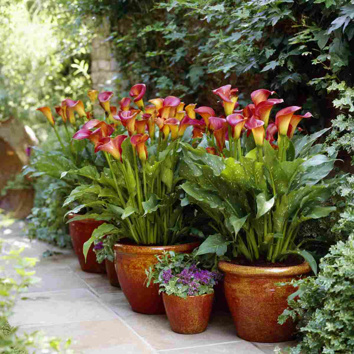 Red calla lilies look striking in accent pots placed near entryways or patios.