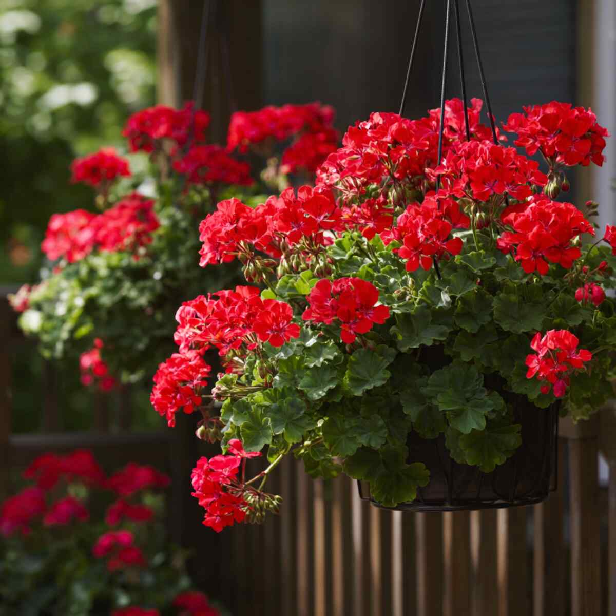 Red geraniums thrive in hanging baskets, spilling over with rich blossoms.