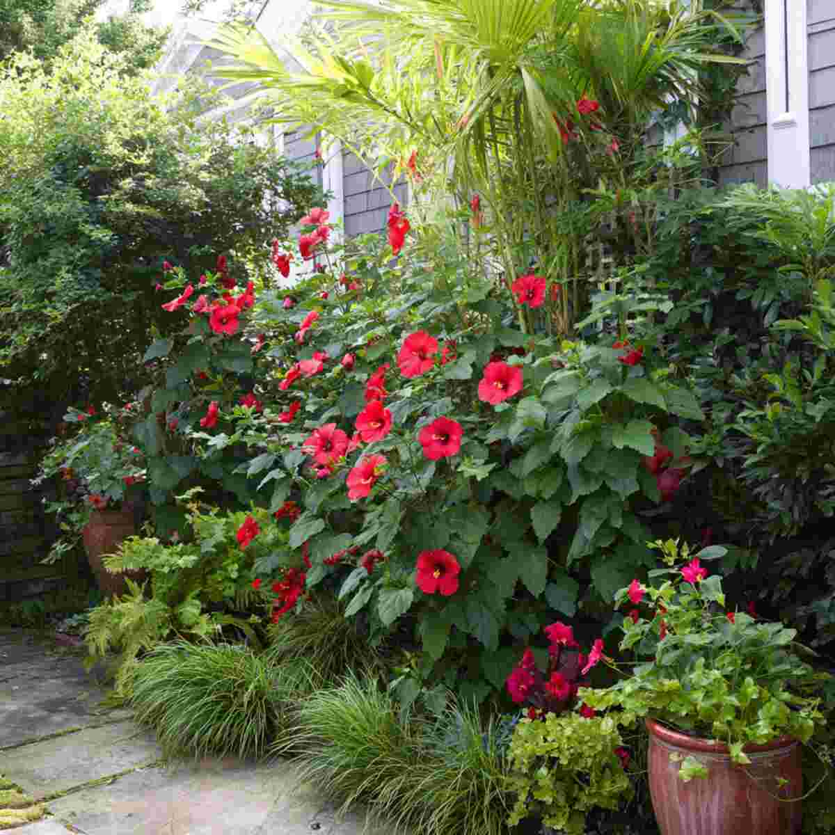 Red hibiscus flowers bring a tropical touch to your garden with their large, showy petals.