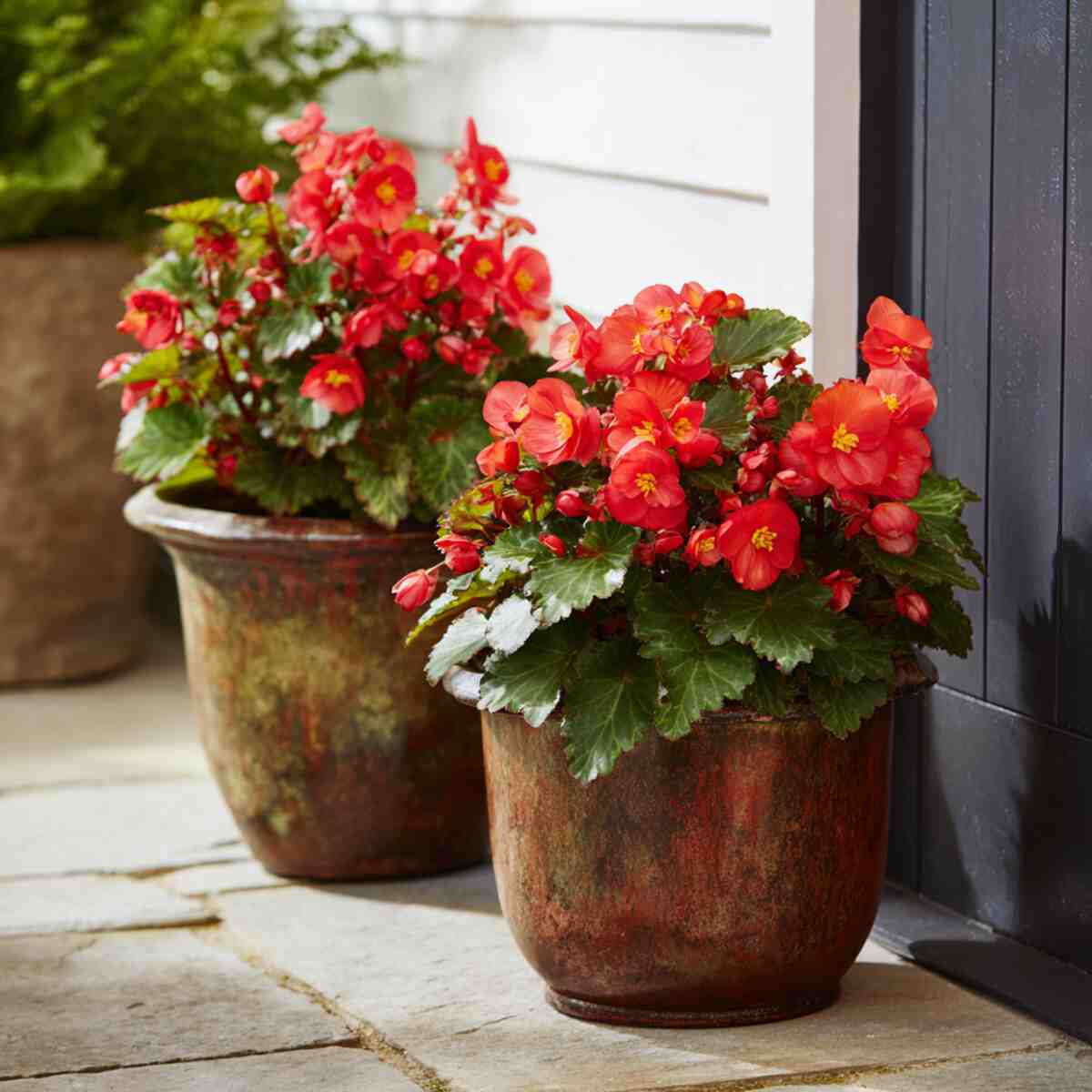 Red begonias shine in patio planters, offering nonstop color through the growing season.