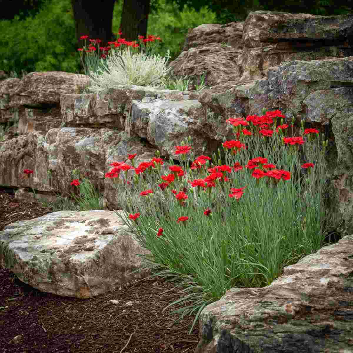 This Red Flowers Garden Idea combines beauty with resilience, as carnations tolerate dry conditions. They bring soft color to the rugged look of stones.
