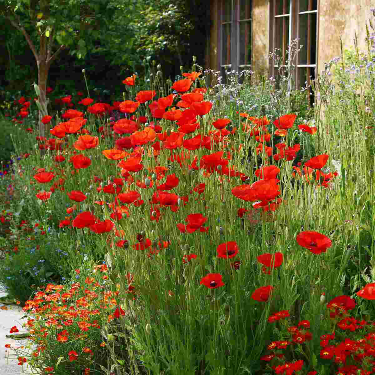 A patch of red poppies creates a dreamy, natural meadow-like feel.