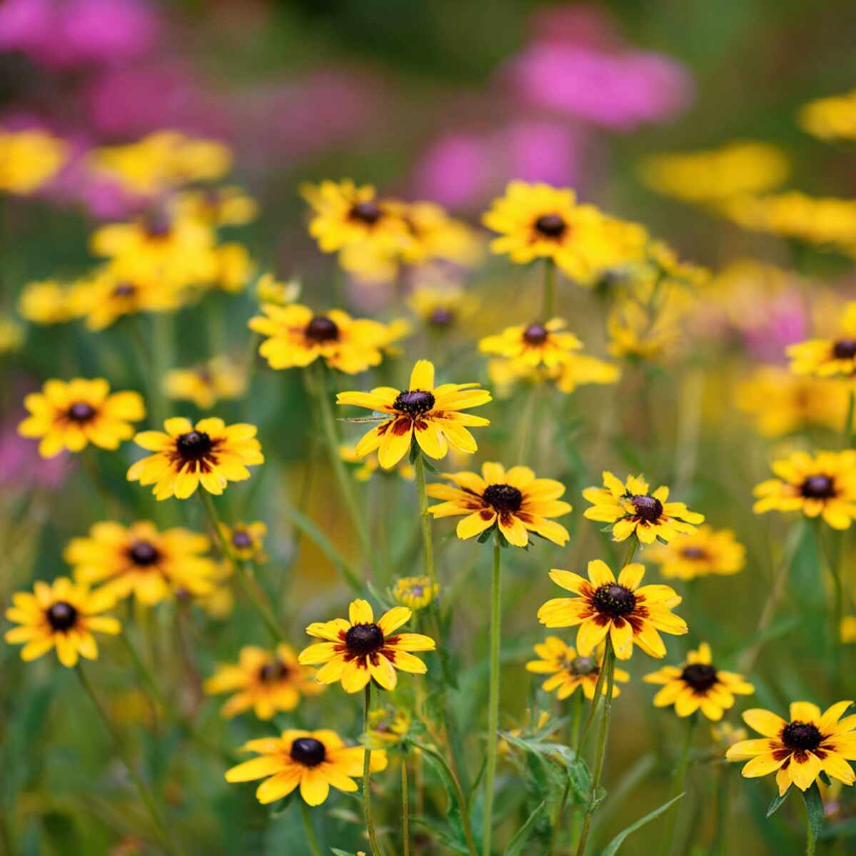 Rudbeckia hirta, also known as Gloriosa Daisy, produces bright golden petals with dark centers. It self-sows freely and attracts butterflies, ensuring a lively summer display.