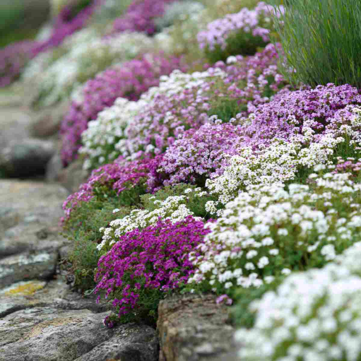 Sweet Alyssum spreads a carpet of fragrant, tiny white or purple flowers. It self-seeds easily, filling gaps in garden beds with soft, continuous blooms.