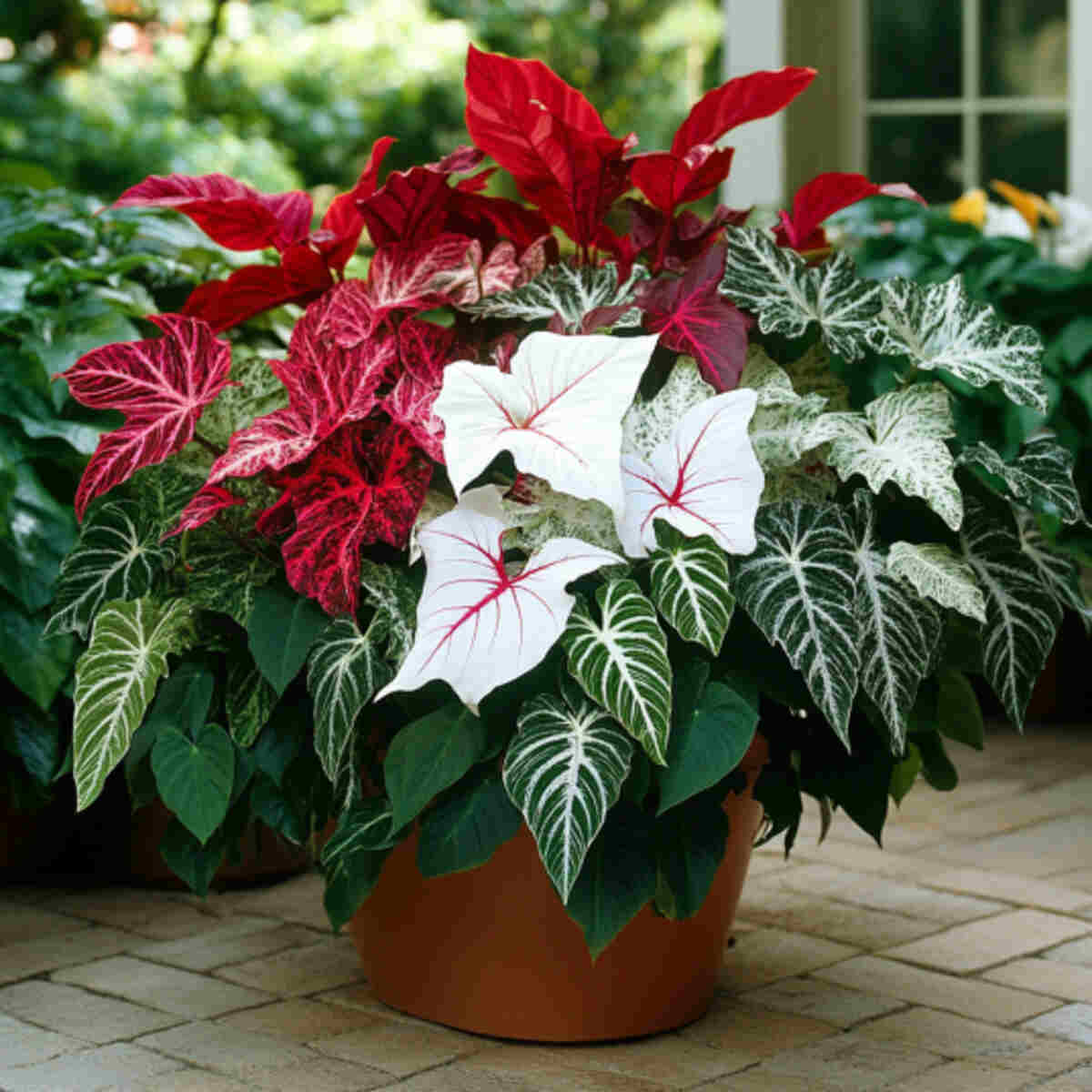 Caladiums are known for their striking heart-shaped leaves, which enhance Shady Balcony Planting Garden Ideas with bold color.