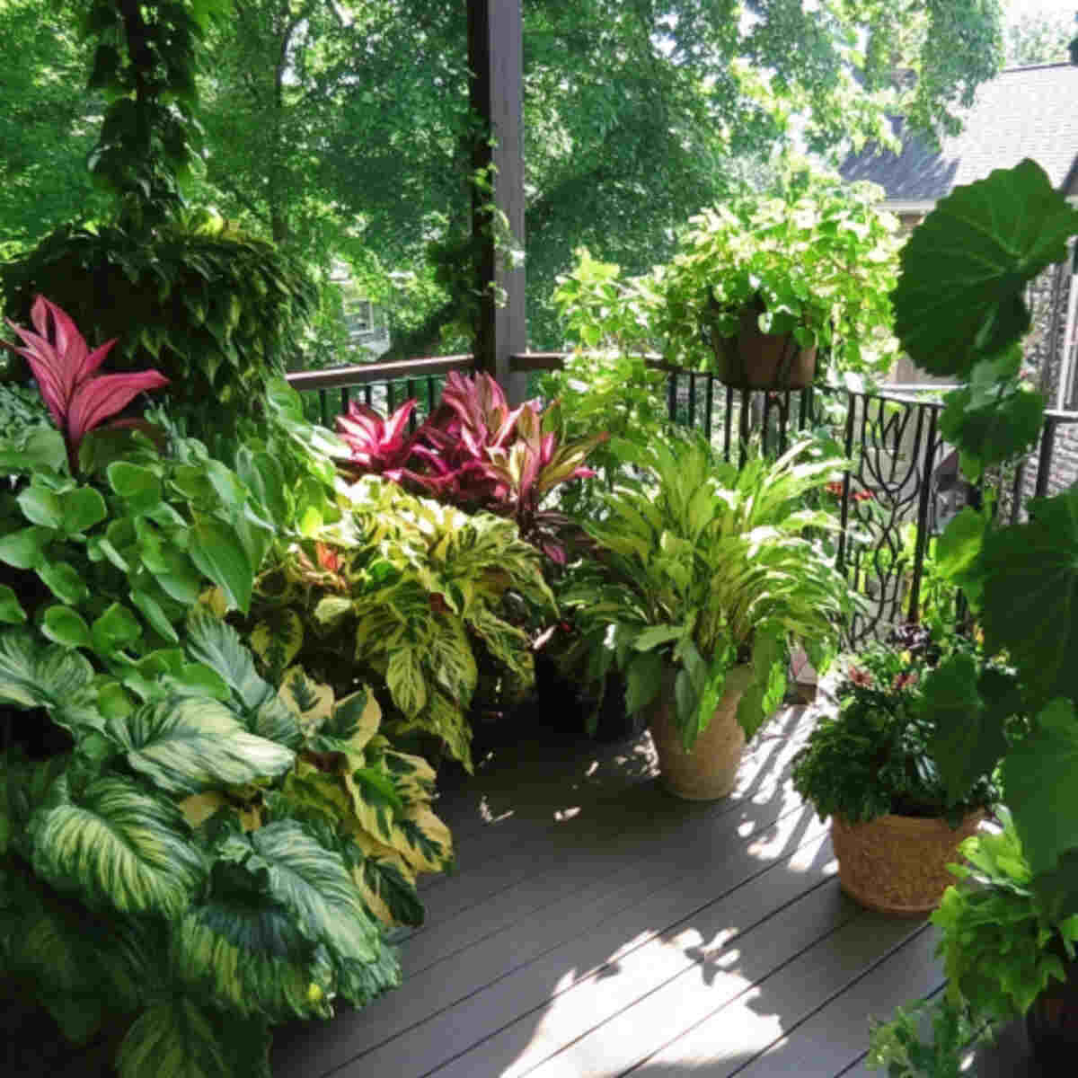 Placing them in decorative pots adds style and color to the shaded space. Their large, patterned leaves create a bold focal point on any balcony.