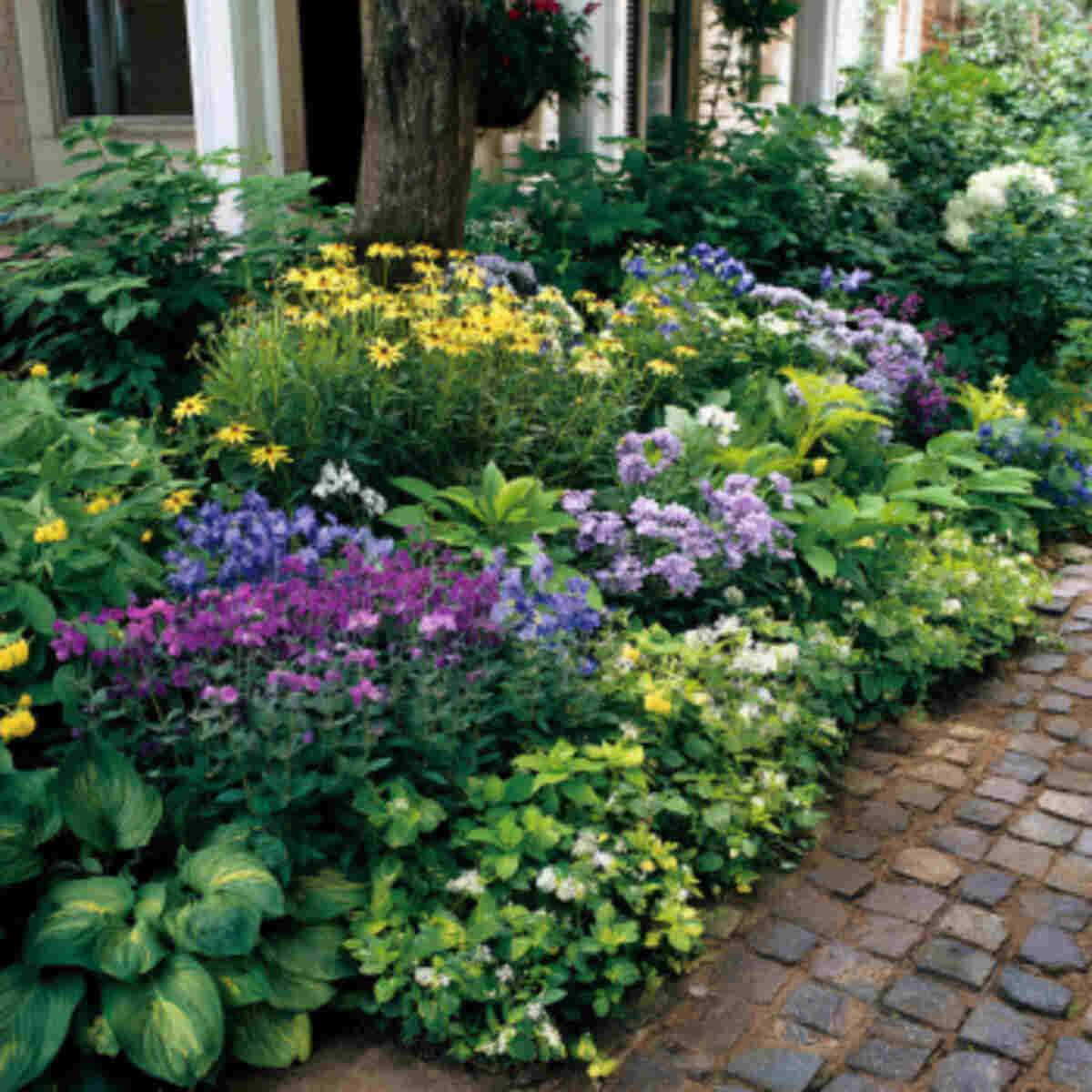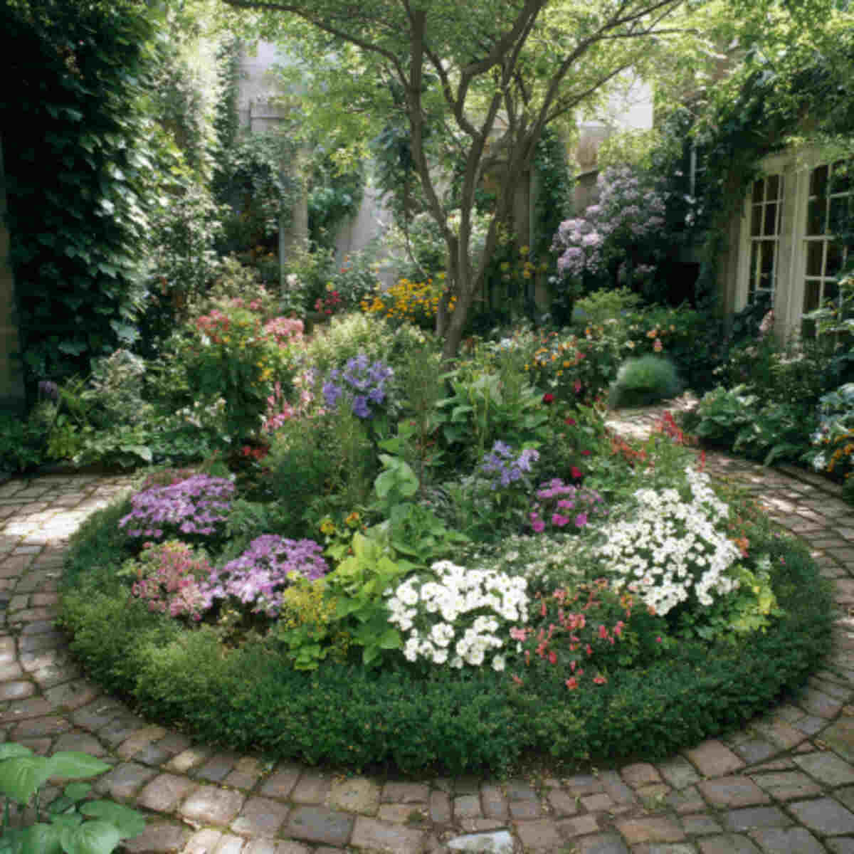 A circular flower bed makes an eye-catching centerpiece in any small urban yard.