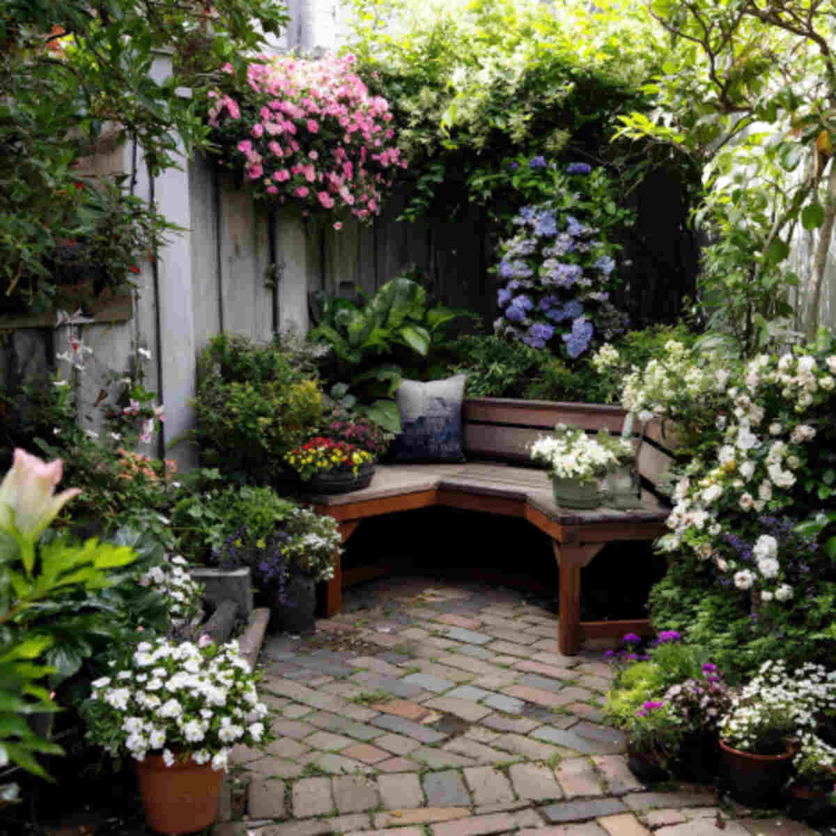 Transform a small yard corner into a cozy spot surrounded by flowers and a small bench. You can enjoy your morning tea surrounded by blooms like roses or jasmine.