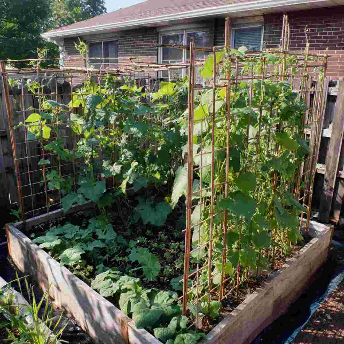 This layout uses one or two corners of the square grid for trellis plants like cucumbers, beans, or peas.