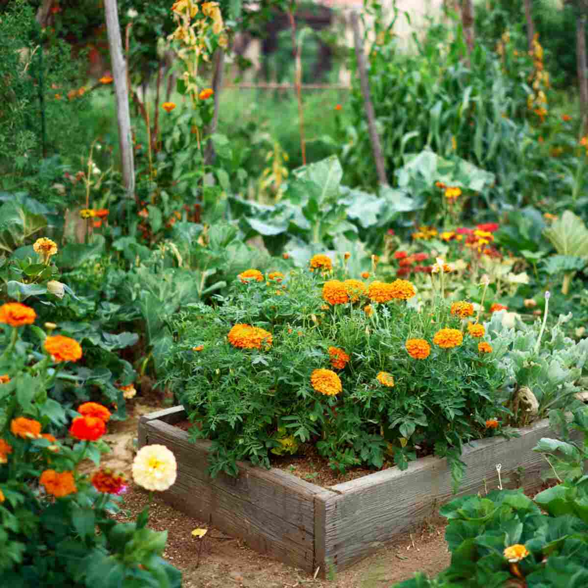 A pollinator-friendly layout mixes vegetables with flowers like marigolds, zinnias, and nasturtiums in selected squares.