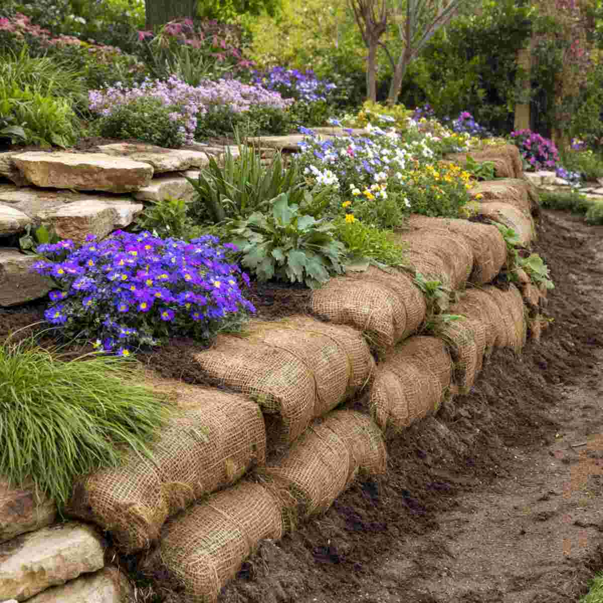 It’s an affordable and eco-conscious choice for gardeners dealing with new or disturbed slopes. In Preventing Soil Erosion on Slopes Garden Ideas, jute netting provides temporary but effective soil protection.