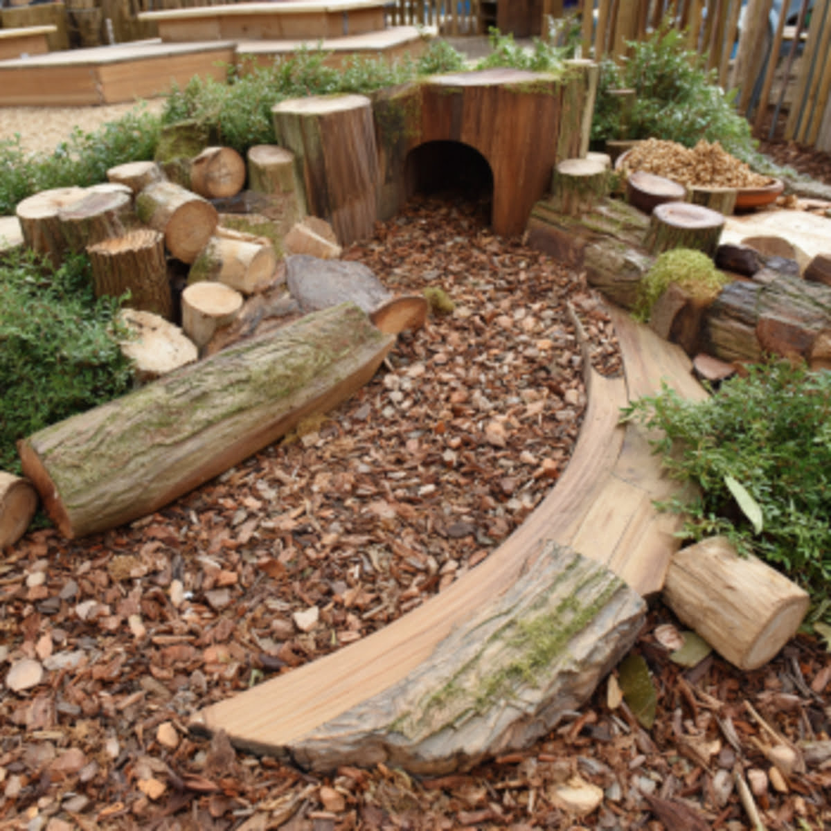 A section covered in bark and woodchips introduces children to rough, crunchy textures underfoot.