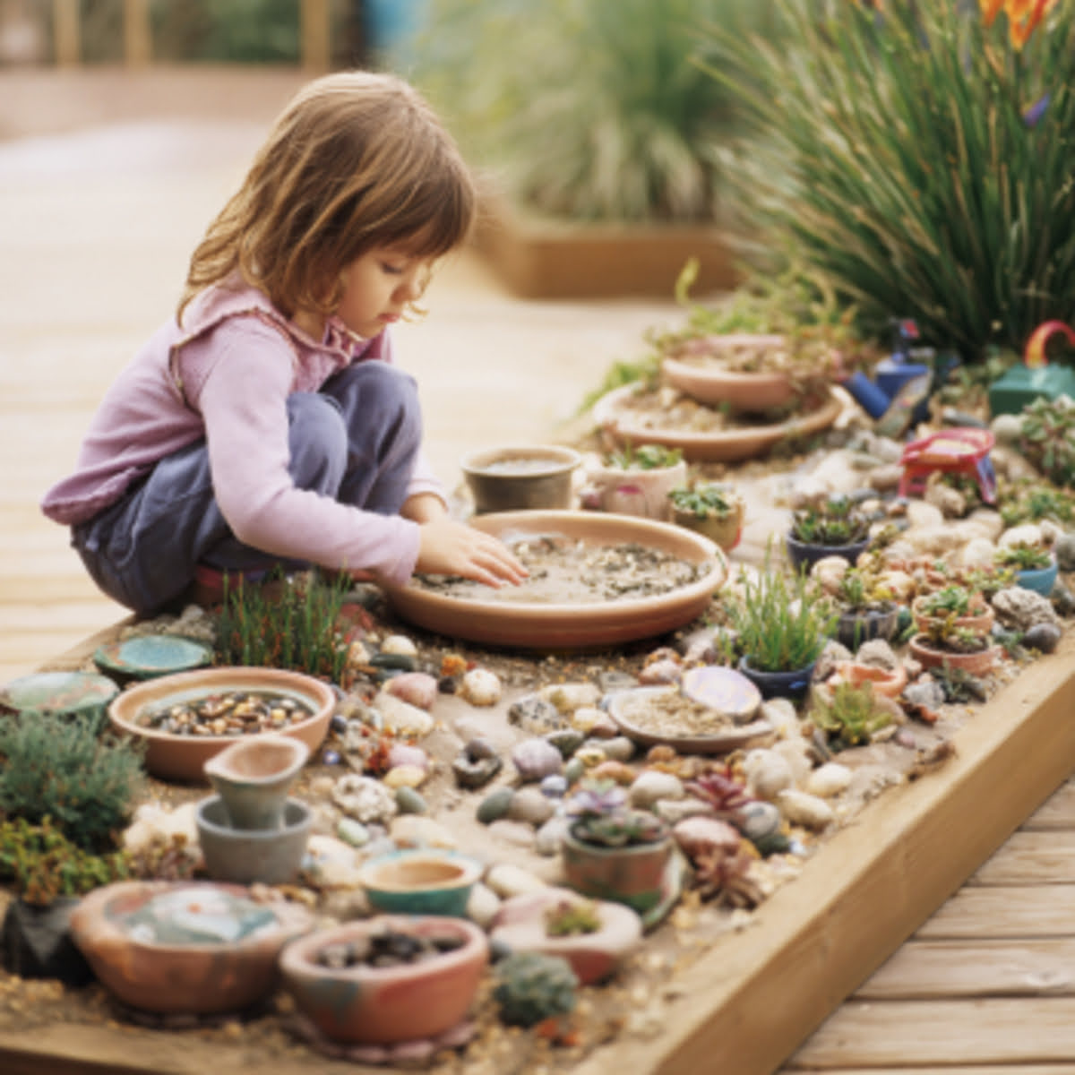 A small fountain, stream, or water wall lets children feel the cool, flowing texture of water. They can splash, dip their hands, or watch how water moves over rocks and plants.