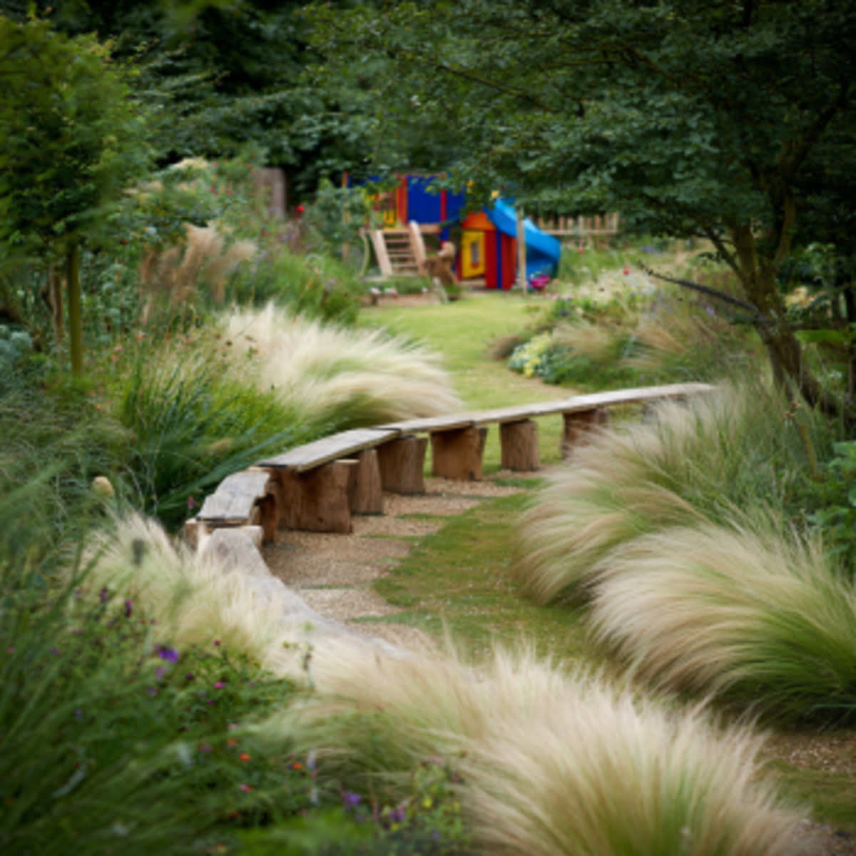 Feather grass or similar soft grasses create a tactile border that children can brush their hands through.
