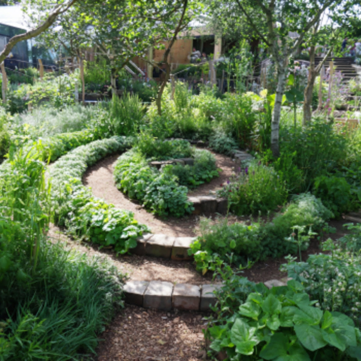 An herb spiral allows children to run their hands through fragrant and textured plants like rosemary, thyme, and mint.