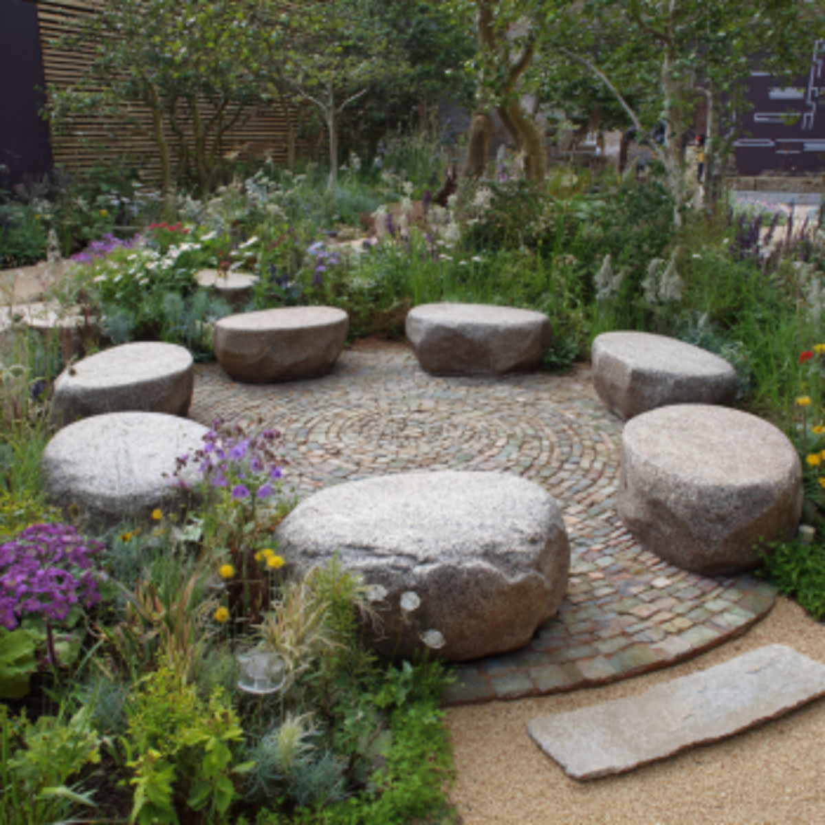 A seating area made of smooth stones or boulders invites children to sit, climb, and touch. The cool, polished surfaces contrast with rougher textures elsewhere in the garden.