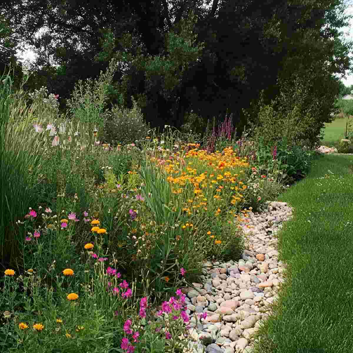 A rain garden Wildflower Meadow Strip Garden Idea captures runoff and channels it into moisture-loving wildflowers.