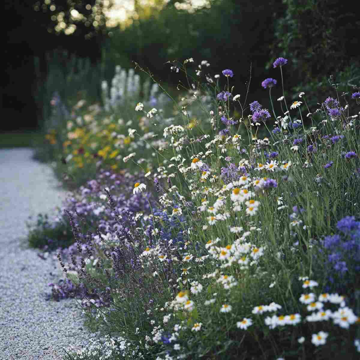 This Wildflower Meadow Strip Garden Idea relies on long-lived perennials that return year after year. It creates a stable, low-maintenance meadow effect along the edge of paths, fences, or lawns.