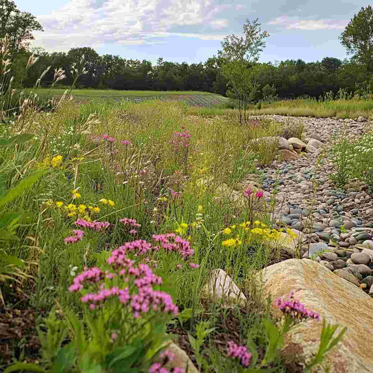 Plants like Joe Pye weed and swamp milkweed thrive in these wetter zones. This idea is important because it naturally manages water while enhancing biodiversity and beauty.