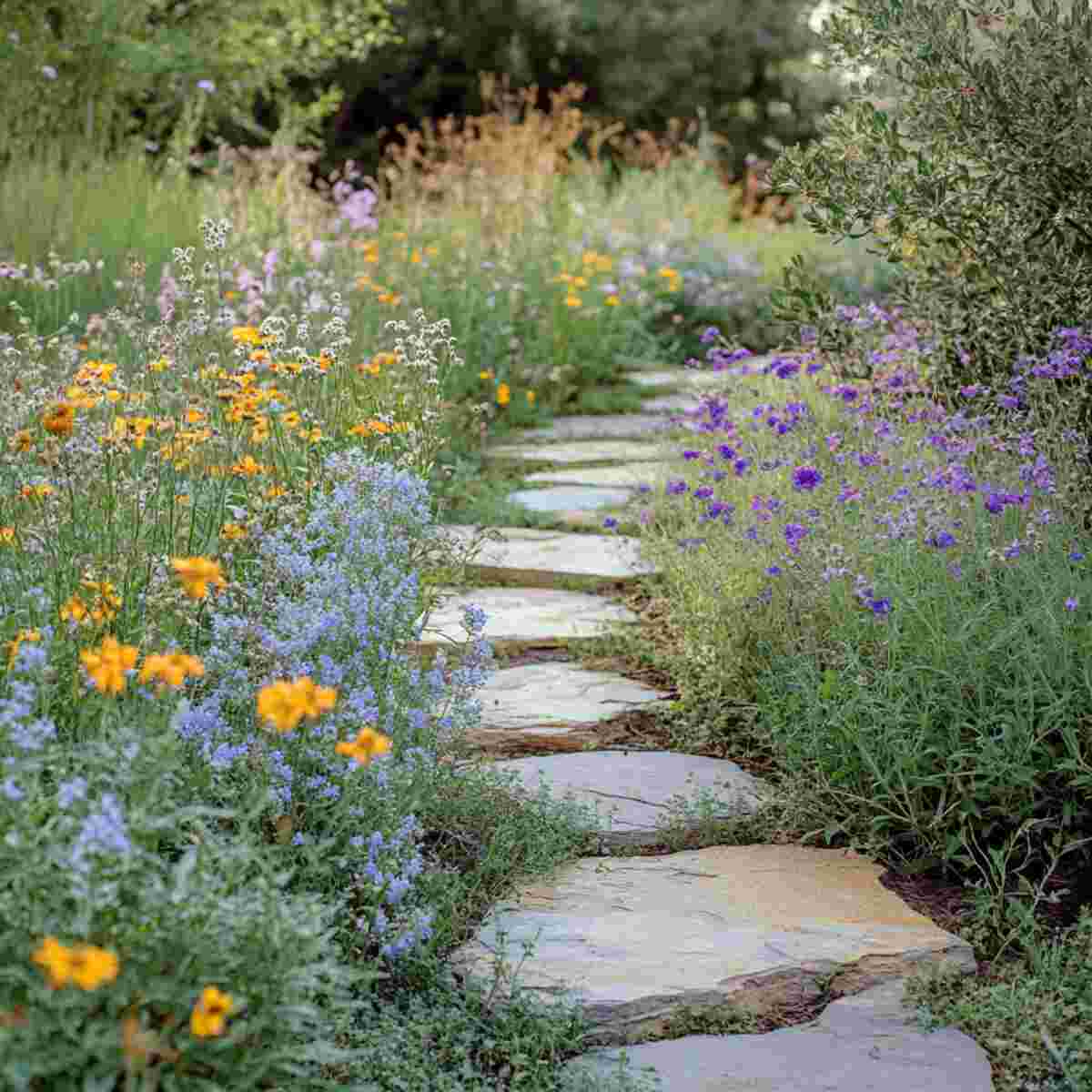 This Wildflower Meadow Strip Garden Idea includes a simple stepping-stone walkway woven between blooms.