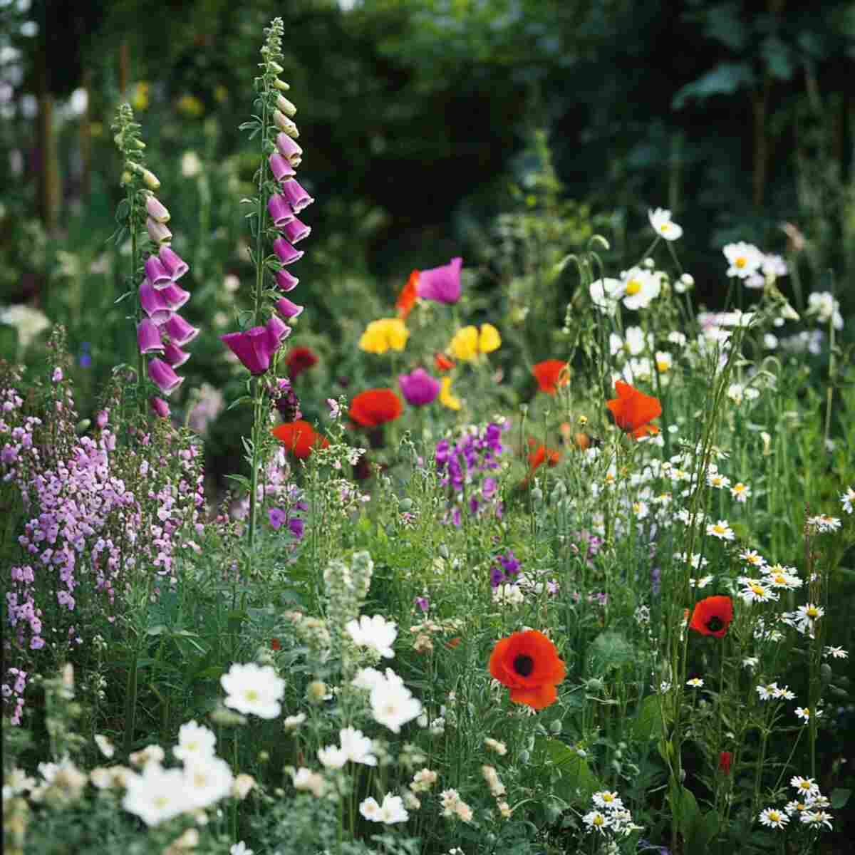 Inspired by cottage gardens, this Wildflower Meadow Strip Garden Idea blends traditional favorites like foxglove, poppies, and daisies.