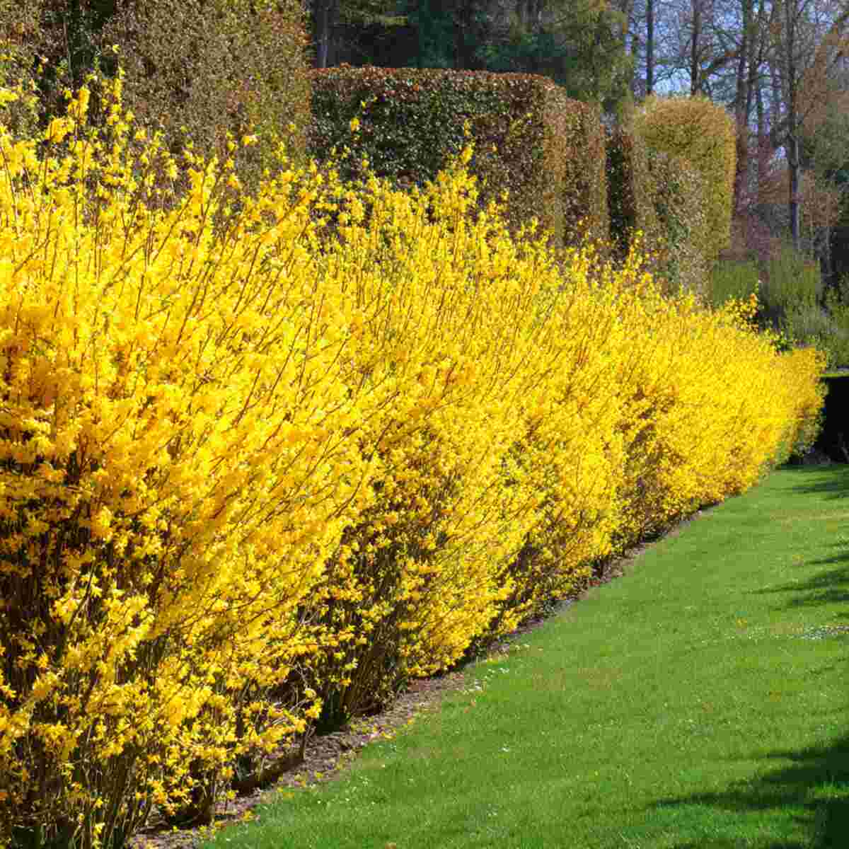 Forsythia shrubs bloom with masses of yellow flowers in early spring before their leaves appear.