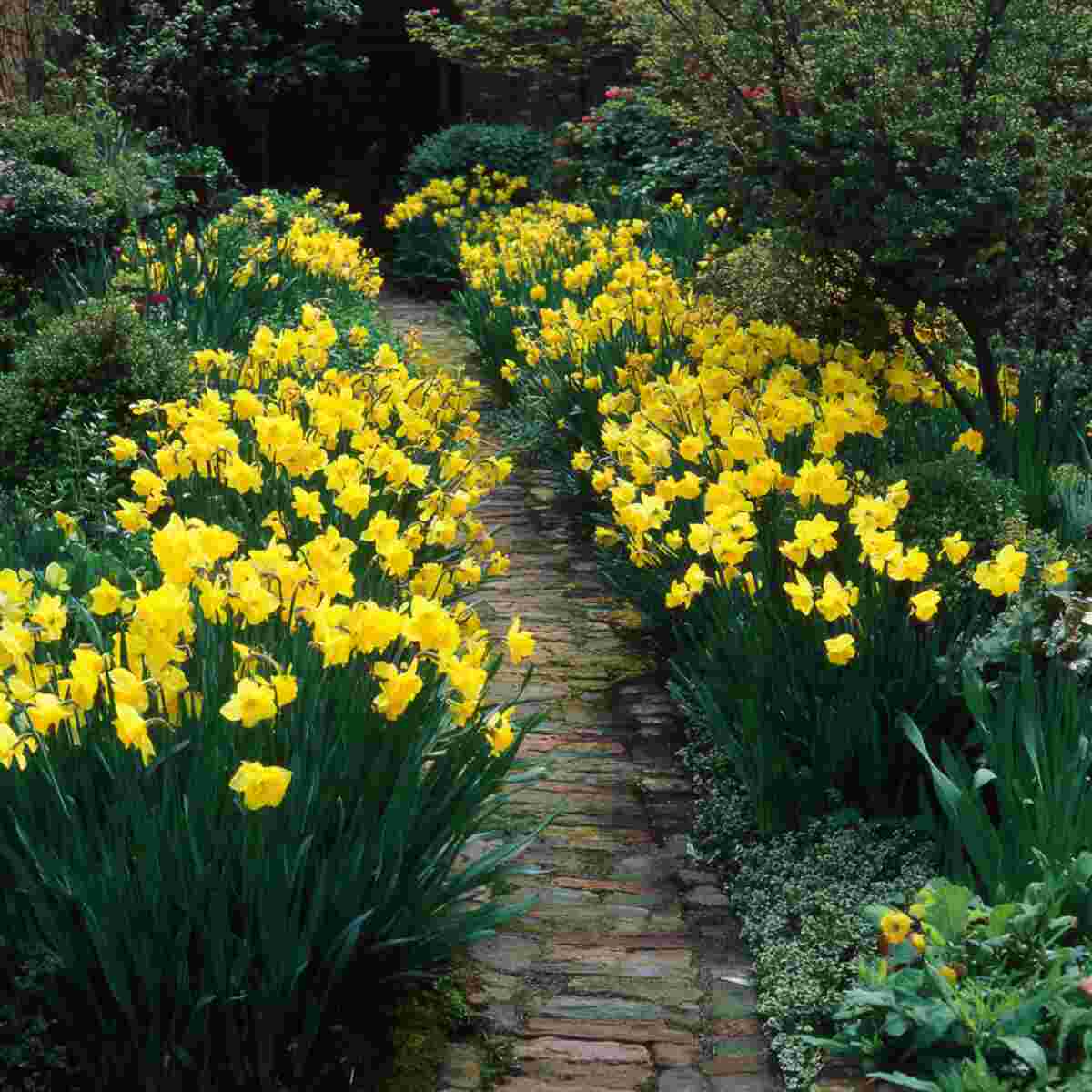 Lining your pathway with daffodils is a charming way to guide visitors while embracing Yellow Flowers Garden Ideas.